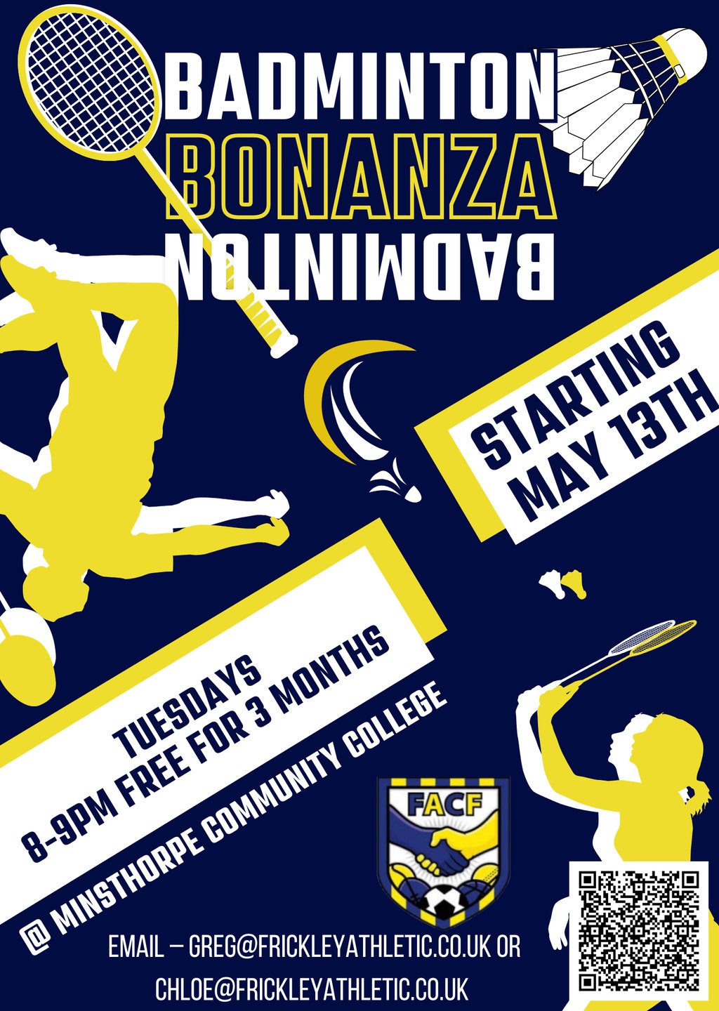 greg@frickleyathletic.co.uk or 07476 204901